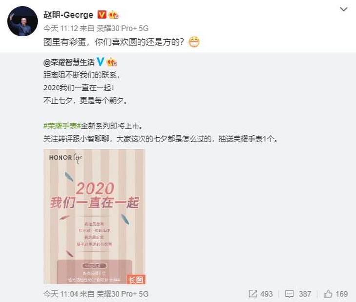 8月25日榮耀智慧生活發(fā)布動(dòng)態(tài),內(nèi)容為:距離阻不斷我們的聯(lián)系,2020我們一直在一起!不止七夕,更是每個(gè)朝夕。#榮耀手表#全新系列即將上市。關(guān)注轉(zhuǎn)評(píng)跟小智聊聊,大家這次的七夕都是怎么過的,抽送榮耀手表1個(gè)。