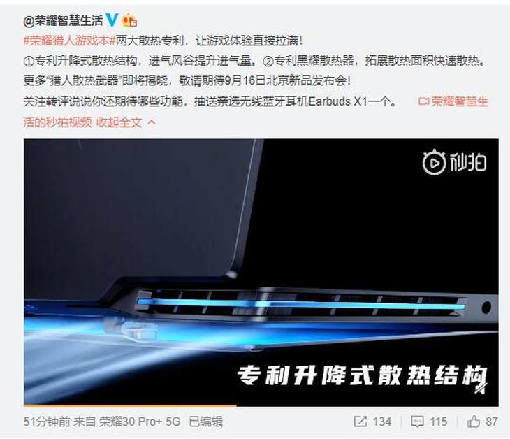 9月8日消息,榮耀智慧生活官方與昨日曝光了旗下獵人系列游戲本的較新消息,據(jù)官方放出的視頻及文字顯示,榮耀獵人游戲本加搭載兩項專利散熱設計: