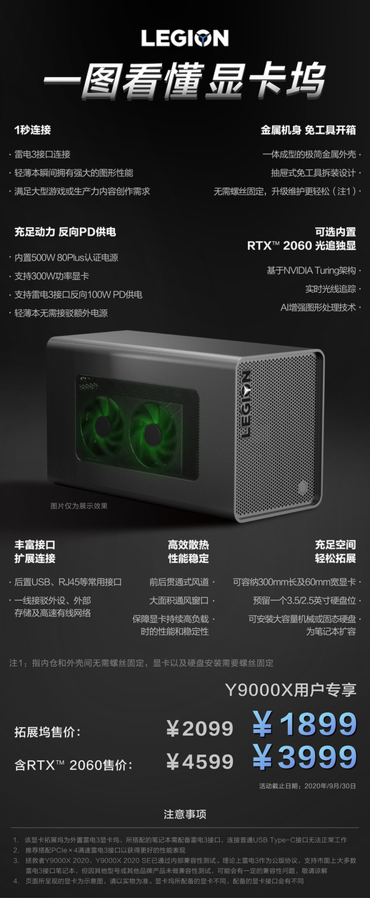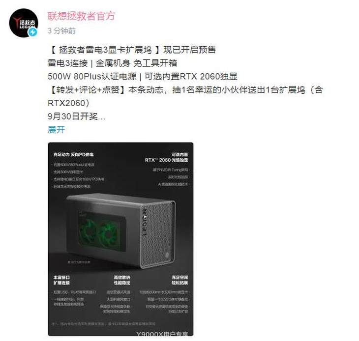 9月15日消息。聯想拯救者官方宣布旗下雷電三拓展塢已開始預售,具有以下特點:雷電三連接、金屬機身 免工具開箱、500W 80Plus認證電源、可選內置RTX 2060獨顯。售價2099元起。