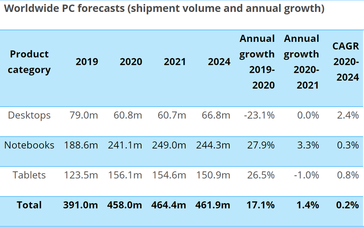 同時,Canalys還根據前三季度的走勢預測2020年PC(臺式機+筆記本+平板)全球出貨量將達4.58億臺,較2019年增長17%,到2021年這一數字將再增長1.4%,至4.64億臺。