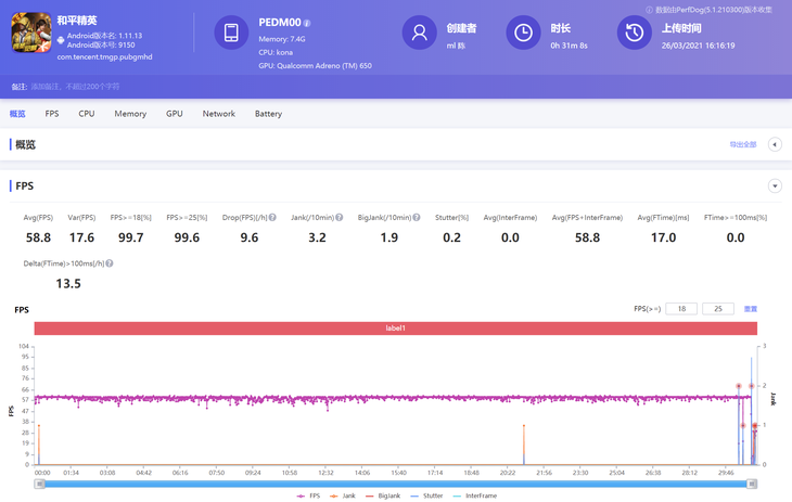 《和平精英》HDR+畫質(zhì)60幀模式,同樣沒有壓力,全程滿幀,平均功耗4.1W。