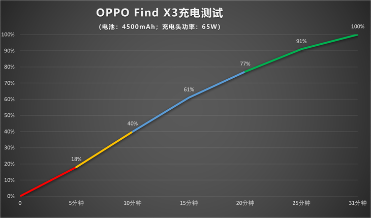 Find X3配備了4500mAh大電池,與之搭配的為65W超級閃充,支持30W無線閃充,可實現(xiàn)10W無線反向充電。實測15分鐘充電61%,完整充滿僅需31分鐘。
