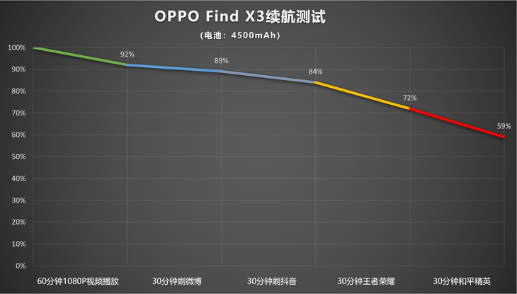 續(xù)航方面,屏幕開啟2K+120Hz+50%亮度,充滿電后經(jīng)過連續(xù)3小時續(xù)航測試,F(xiàn)ind X3剩余電量59%。
