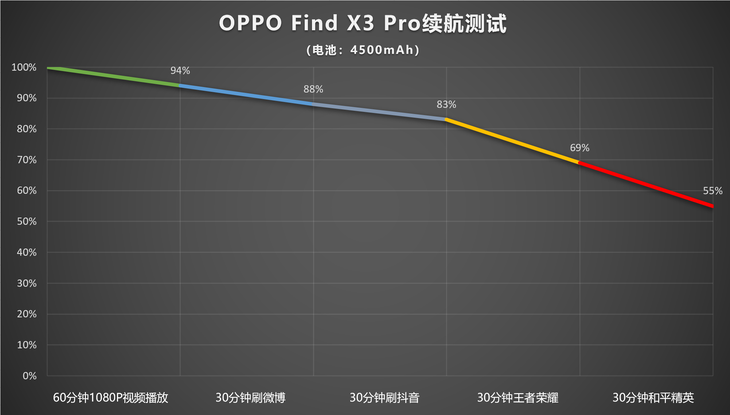 相比之下,搭載驍龍888平臺的Find X3 Pro,最終剩余電量為55%,耗電量相對略高一些,不過兩者差距不大,都算比較不錯的續(xù)航表現(xiàn)。