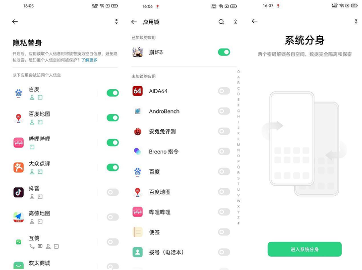 在隱私方面,ColorOS 11.2也在原來基礎(chǔ)上帶來了四大升級。隱私替身,在應(yīng)用需要讀取個人信息才允許使用時,系統(tǒng)會給它一個空白信息,避免隱私泄露;私密保險箱,可以將自己私密的照片、文件保護起來;應(yīng)用鎖,可以在手機被借用時讓指定應(yīng)用的私密數(shù)據(jù)不會泄露;無痕系統(tǒng)分身,更是能通過不同指紋進入各自的系統(tǒng),實現(xiàn)數(shù)據(jù)的徹底隔絕。