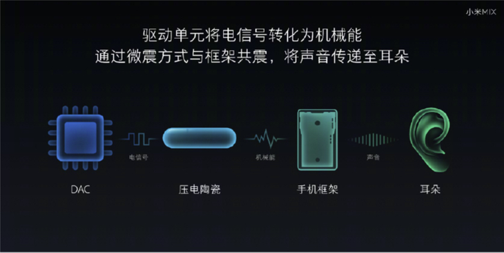 實(shí)現(xiàn)全面屏設(shè)計(jì)最大的難點(diǎn)就在于解決屏幕的上邊框?qū)挾?,傳統(tǒng)的手機(jī)頂部往往集成了非常多的元器件,在當(dāng)時(shí)技術(shù)條件下要把這些器件隱藏起來尤為困難。MIX為了實(shí)現(xiàn)上邊框的最窄化,首次采用懸臂梁式壓電陶瓷聲學(xué)系統(tǒng),當(dāng)電話接通時(shí),驅(qū)動單元將電信號直接轉(zhuǎn)化為機(jī)械能,通過微震點(diǎn)擊的方式帶動整機(jī)的中框共振,將聲音傳遞至耳朵。這種為追求極致設(shè)計(jì)而無懼技術(shù)風(fēng)險(xiǎn)的突破精神,至今都可以算是難能可貴。