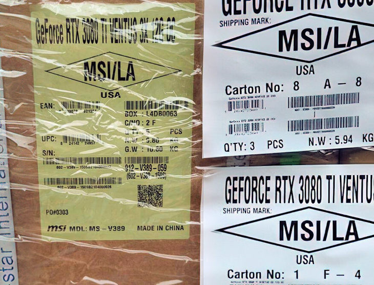 近日,有一批發(fā)往美國市場的微星RTX3080Ti顯卡的外包裝箱在網(wǎng)絡上曝光了。這批顯卡的型號為微星GeForce RTX 3080 Ti Ventus 3X 12G OC。12GB顯存容量已是板上釘釘?shù)氖虑榱恕?/p>