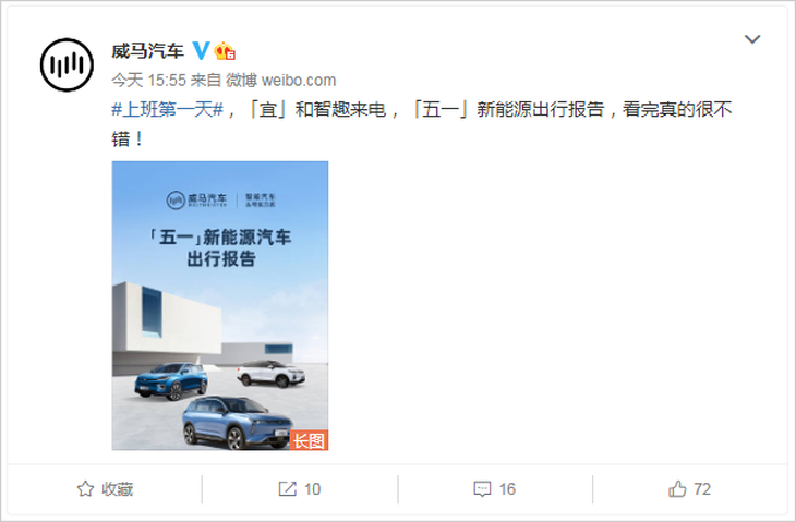 五一過后上班頭一天,威馬汽車發(fā)布了五一新能源汽車出行報告,感興趣的朋友們可以到威馬汽車新浪官微瞧一瞧。