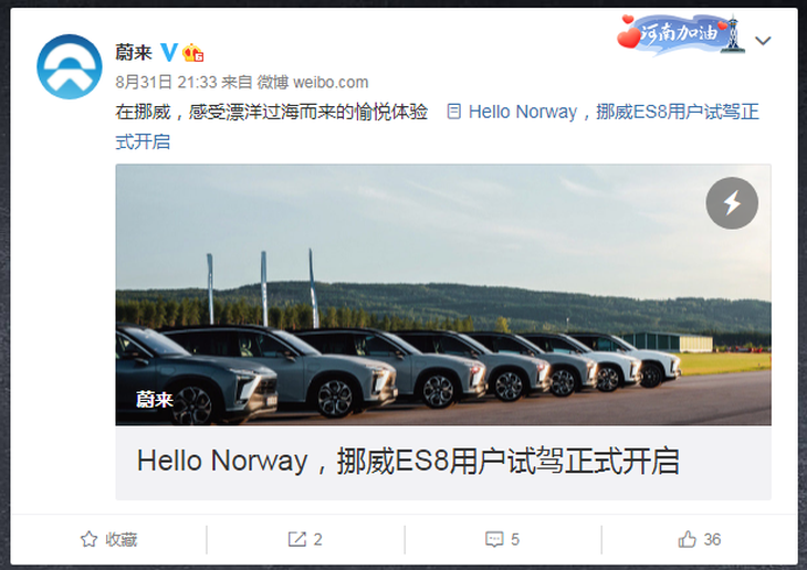 進(jìn)軍北歐市場 蔚來ES8挪威用戶試駕正式開啟