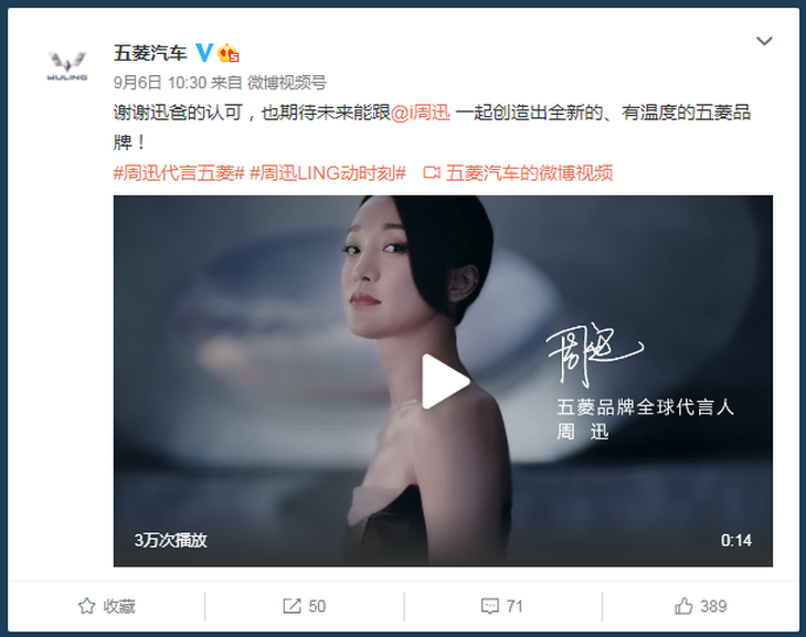 五菱汽車找代言人啦!周迅成為五菱品牌全球代言人