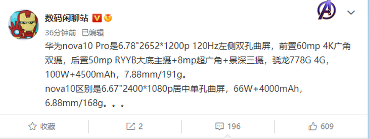 ? ? 據(jù)爆料,華為nova 10 Pro前置6000萬4K廣角雙攝,后置5000萬RYYB大底主攝+800萬超廣角+景深三攝,內(nèi)置4500mAh電池,支持100W快充。至于華為nova 10,該博主透露,該機(jī)采用一塊6.67英寸居中單孔曲面屏,分辨率為2400*1080,厚6.88mm,重約168g,內(nèi)置4000mAh電池,支持66W快充。