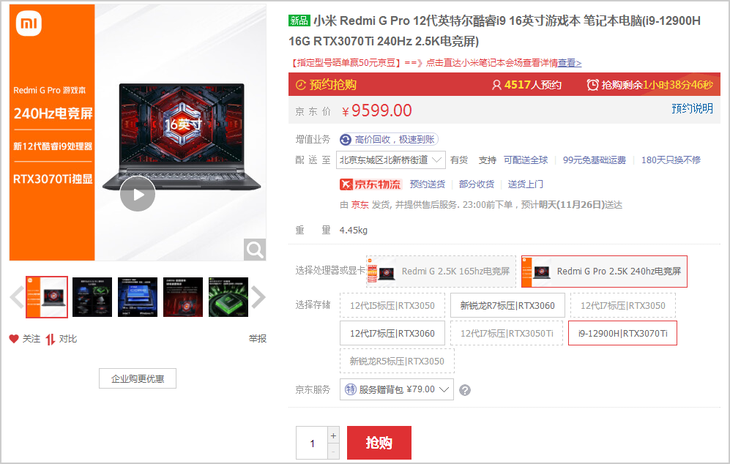 i9-12900H搭RTX3070Ti,Redmi G Pro游戲本特價9599