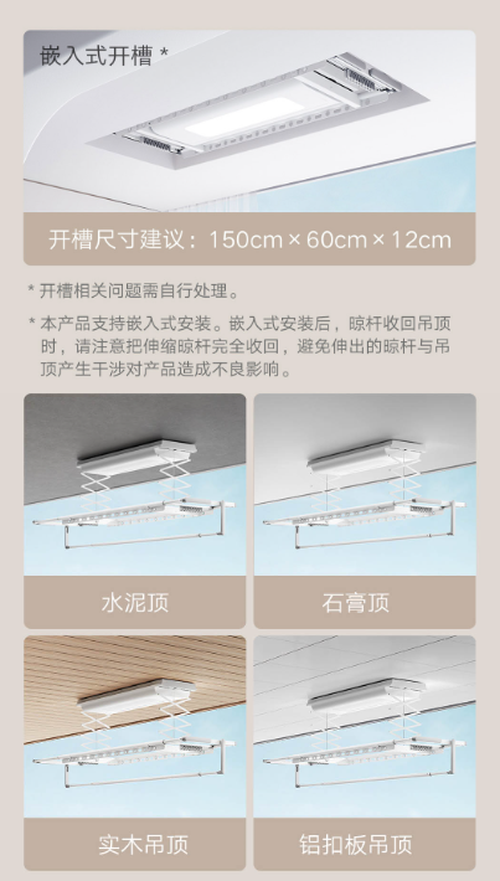 ? ? 與米家智能晾衣機不同的是,米家智能晾衣機1S采用超薄機身設(shè)計,支持嵌入隱藏安裝,晾桿收回后可完全隱藏于吊頂內(nèi)部,不擋陽光不擋窗,晾衣桿收起狀態(tài)厚度僅9.9cm,比前代薄了近30%。
