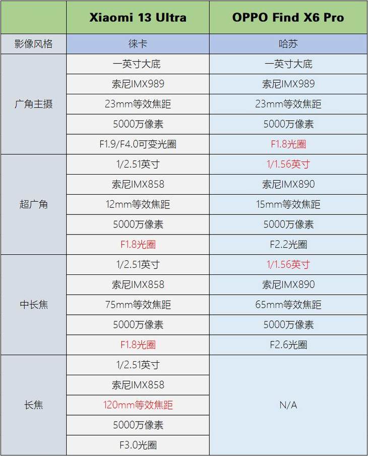 ? ? 首先,我們先來看看小米13 Ultra與OPPO Find X6 Pro的后置鏡頭配置情況。從下表的對比中可以看到,兩款手機(jī)對于后置鏡頭的搭配十分“統(tǒng)一”,除了廣角主攝都是1英寸IMX989感光元件外,其他鏡頭搭配的都是同一型號CMOS感光元件,小米13 Ultra為IMX858,OPPO Find X6 Pro則是IMX890,這樣能更好對整體的影像系統(tǒng)進(jìn)行調(diào)校。此外,小米13 Ultra為四攝組合,相比OPPO Find X6 Pro多了一個(gè)120mm等效焦距(5X)的長焦鏡頭;而OPPO Find X6 Pro雖然是三攝的配置,但除1英寸廣角主攝外,超廣角和潛望式鏡頭也都采用了大尺寸的旗艦級IMX890傳感器,妥妥的三主攝配置。