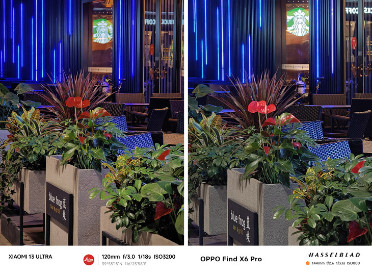 ? ? 這一組色彩對比比較強(qiáng)的場景中,很明顯小米13 Ultra更加濃郁、鮮艷,并擁有更高的對比度,即便使用的徠卡經(jīng)典模式拍攝,但紅色的燈籠與綠葉都十分生動;OPPO Find X6 Pro更加強(qiáng)調(diào)自然、柔和的色調(diào),畫面呈現(xiàn)出更為淡雅、溫暖的色調(diào),同時(shí)細(xì)節(jié)表現(xiàn)也相對較為柔和。