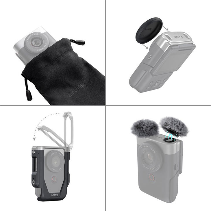 ? ? SmallRig 4235兔籠套裝包括PowerShot V10內(nèi)置麥克風(fēng)的防風(fēng)罩,防風(fēng)罩通過(guò)額外的磁性墊片安裝,SmallRig表示可以降低約20dB的風(fēng)噪,提高錄音效果;至于硅膠鏡頭蓋可保護(hù)鏡頭免受刮花,連同收納袋,可為裝上兔籠的PowerShot V10提供周全保護(hù)。不過(guò),需要留意的是,使用防風(fēng)罩后會(huì)遮擋觸控式屏幕近 1/3畫面。
