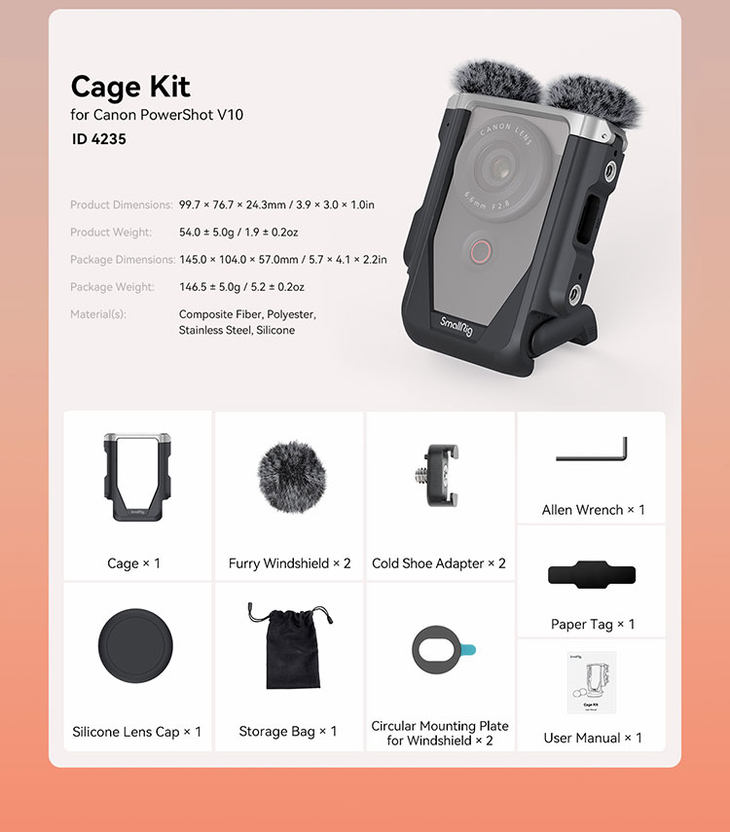 ? ? ?SmallRig 4235兔籠凈重42g,針對(duì)佳能PowerShot V10而設(shè)計(jì),使用兔籠后仍然不妨礙使用相機(jī)的可調(diào)校式支架、向上翻轉(zhuǎn)觸控屏幕和其他的端子插孔。以不銹鋼制造的兔籠外圍提供四個(gè)1/4"-20螺絲孔,既可裝上三腳架,也可以安裝附贈(zèng)的冷靴(2個(gè)),再通過(guò)冷靴轉(zhuǎn)接補(bǔ)光燈和外置收音設(shè)備。