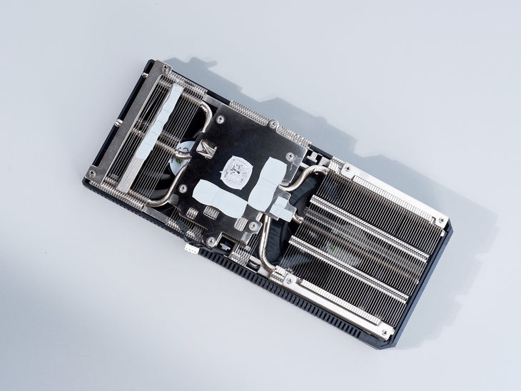 這款顯卡雖然長度為25cm,但是它的PCB并不長。通過對(duì)比明顯能夠看出散熱器和背板比PCB長出很多。