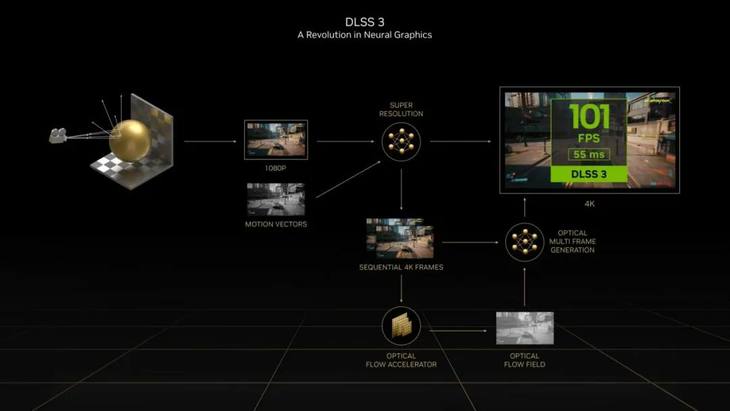 DLSS 3包含有DLSS 2(DLSS超分辨率技術(shù)),以及全新加入的DLSS幀生成技術(shù),這一項(xiàng)DLSS幀生成技術(shù)依托于Ada Lovelace架構(gòu)的獨(dú)立光流處理器以及Tensor Core的AI算力。在一項(xiàng)技術(shù)在運(yùn)行過程中,其通過光流處理器所得到的一系列數(shù)據(jù)后,以光流加速技術(shù)(Optical Flow Acceleration,簡稱為OFA)來生成畫面信息,而AI算力則負(fù)責(zé)來對(duì)畫面進(jìn)行進(jìn)一步的優(yōu)化,從而在游戲中加入了更多的幀畫面,進(jìn)行幀數(shù)的提升。