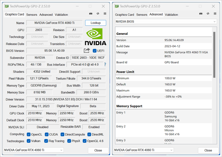 (映眾RTX4060Ti 8GB曜夜顯卡的GPU-Z信息)
