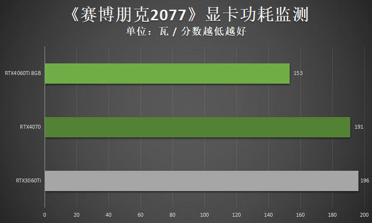 除了性能更強(qiáng)之外,RTX4060Ti 8GB在功耗表現(xiàn)方面也要明顯優(yōu)于上代RTX3060Ti。