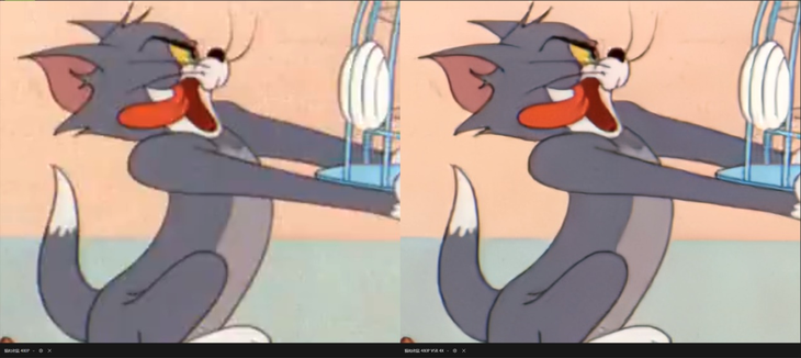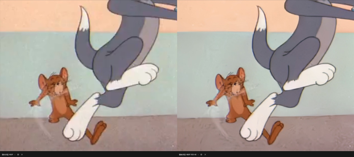 我們也采用映眾RTX4060Ti 8GB曜夜顯卡對(duì)英偉達(dá)推出的VSR功能進(jìn)行了實(shí)際的體驗(yàn),首先選取的是在網(wǎng)頁上播放480P的經(jīng)典動(dòng)畫《貓和老鼠》,這一動(dòng)畫由于成片年代較早,因此畫面在4K分辨率屏幕上的播放存在許多瑕疵。而通過開啟VSR進(jìn)行增強(qiáng)后,畫面的細(xì)節(jié)有了明顯的改善,并且畫面的噪點(diǎn)有了明顯的降低。在這里我們也通過截取同一幀畫面,通過英偉達(dá)ICAT進(jìn)行畫面對(duì)比,方便各位感受到VSR帶來的畫面效果提升。