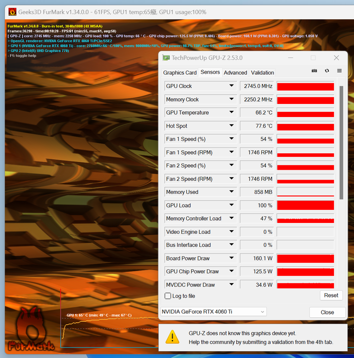 利用FurMark,筆者將對(duì)映眾RTX4060Ti 8GB曜夜顯卡進(jìn)行壓力測(cè)試。