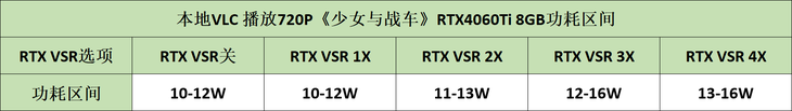 在4K分辨率屏幕下通過本地VLC播放器播放720P《少女與戰(zhàn)車》時(shí),RTX4060Ti 8GB在不同VSR檔位設(shè)置中的功耗區(qū)間如下: