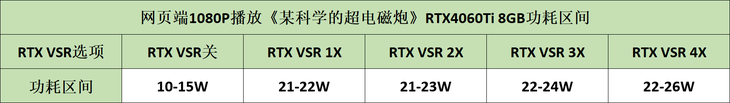 在4K分辨率屏幕下通過網(wǎng)頁端播放1080P《某科學(xué)的超電磁炮》時(shí),RTX4060Ti 8GB在不同的VSR檔位設(shè)置中的功耗區(qū)間如下: