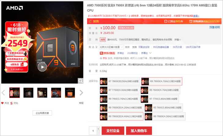 AMD銳龍7000系列處理器618大降價,銳龍9 7900X只要2549元