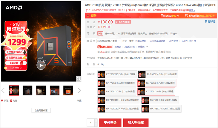 銳龍5 7600X為6核心、12線程設計。這款處理器目前618期間的價格不高于1299元。