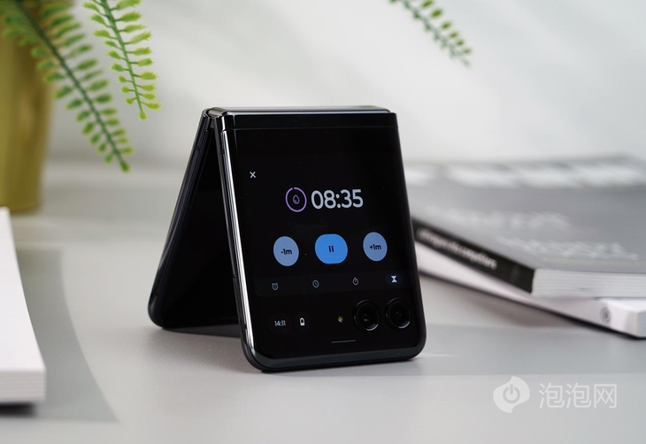 moto razr 40 ultra除了傳統(tǒng)的折疊屏以及展開形式外,還支持帳篷模式,在該模式下手機(jī)可以轉(zhuǎn)變?yōu)橐粋€床頭鬧鐘、或者是桌簽,也可以設(shè)定為計時器。
