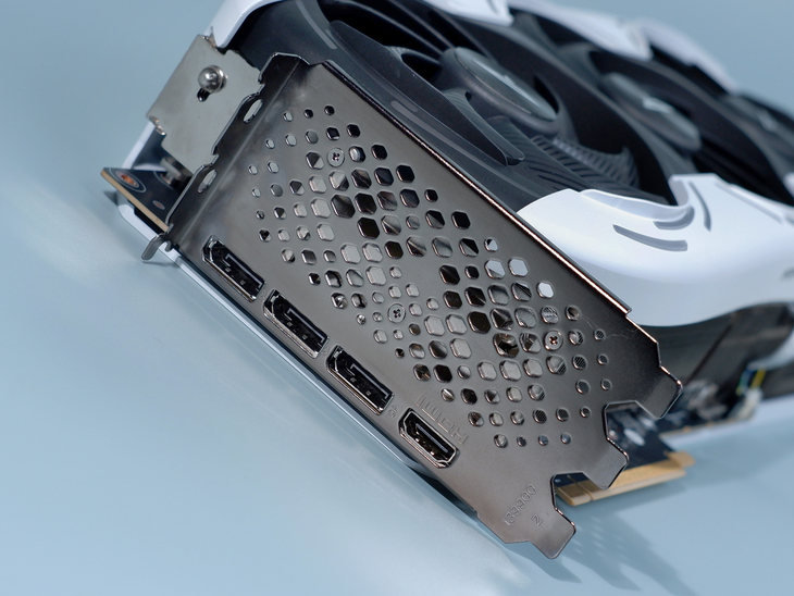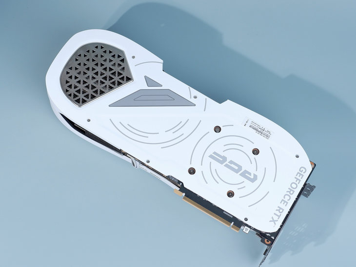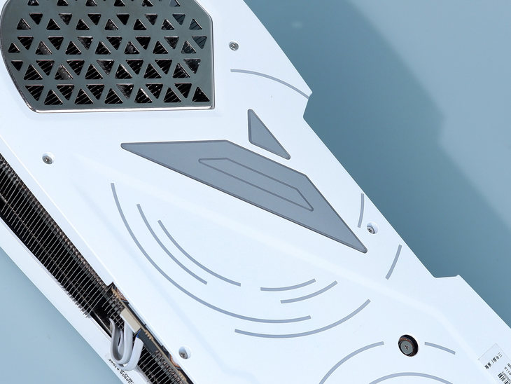 顯卡背面搭配了白色金屬背板。背板尾端擁有鏤空設計,以便兼顧散熱功能。