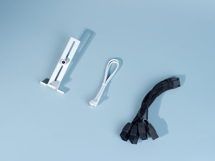 附件方面,這款顯卡附帶了一條12VHPWR接口供電轉接線(4個8pin轉12VHPWR)、一根顯卡支架,一條5V ARGB連接線。