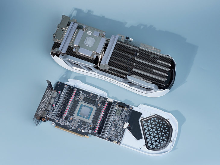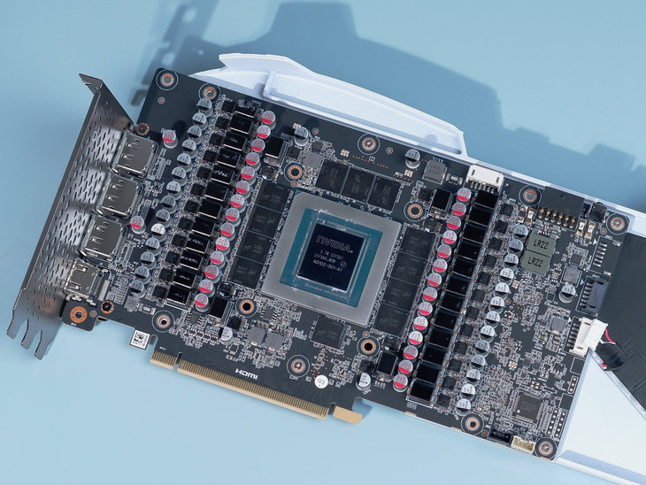 顯存是來自美光的GDDR6X,單顆2GB容量。這款顯卡PCB正面設計有12顆顯存,組建了24GB顯存容量。
