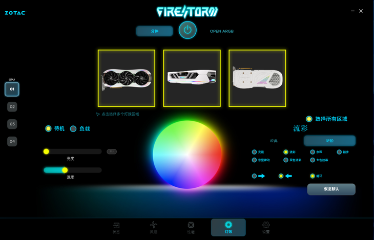 玩家可以利用索泰自行研發(fā)的FireStorm軟件進行燈效設置。
