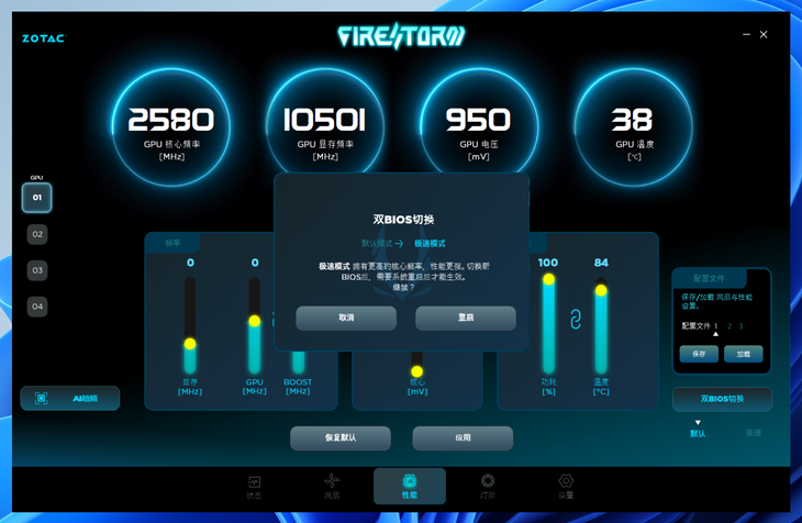 如果平臺已安裝到機箱里面,操作雙BIOS切換按鈕不方便,這種情況下也可以在FireStorm軟件里面進行雙BIOS切換,很方便。