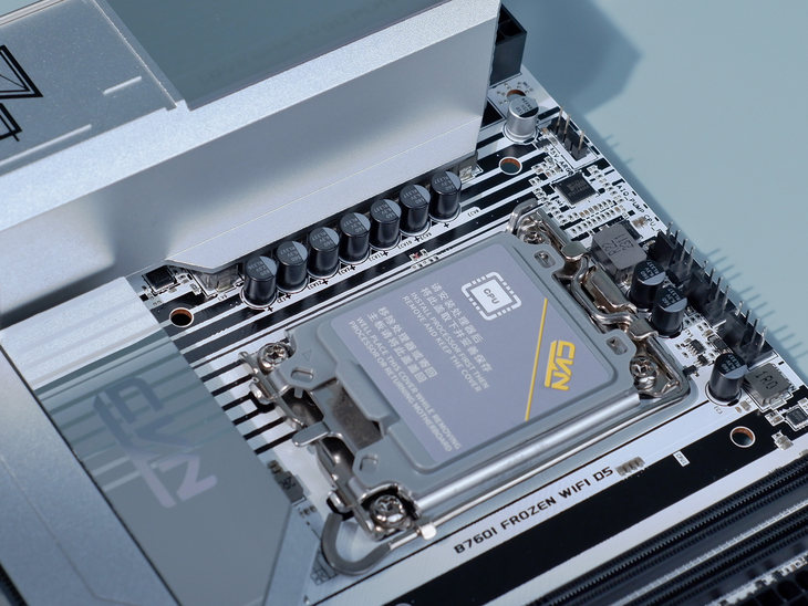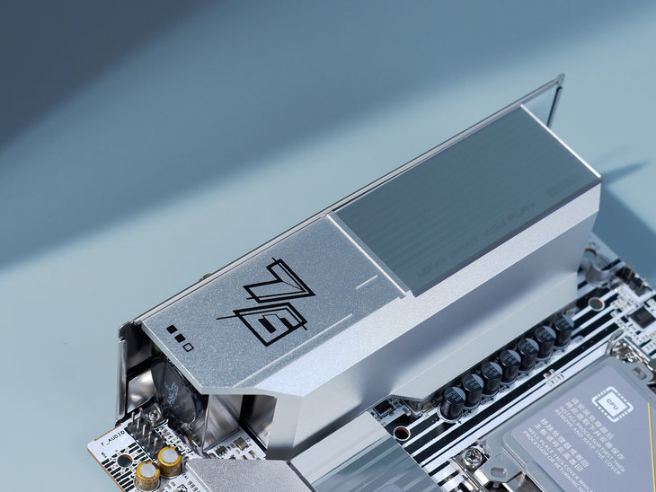 CPU供電散熱模組部分,這款主板覆蓋寒霜散熱裝甲,搭配全覆蓋式冷凝片,可以迅速帶走熱量,助力CPU穩(wěn)定運(yùn)行。