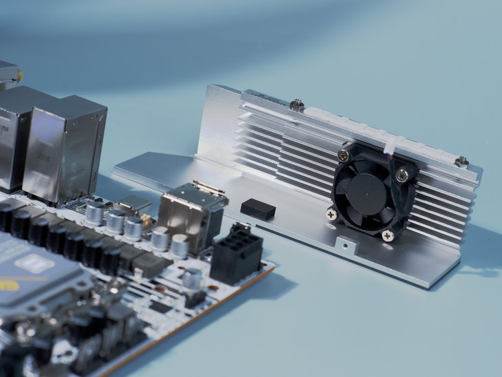 寒霜散熱裝甲與I/O防護(hù)罩采用一體式設(shè)計(jì)。將這塊寒霜散熱裝甲拆卸下來(lái),可見(jiàn)其內(nèi)置一枚小型散熱風(fēng)扇。這種主動(dòng)式的散熱設(shè)計(jì),無(wú)疑能夠進(jìn)一步強(qiáng)化散熱。