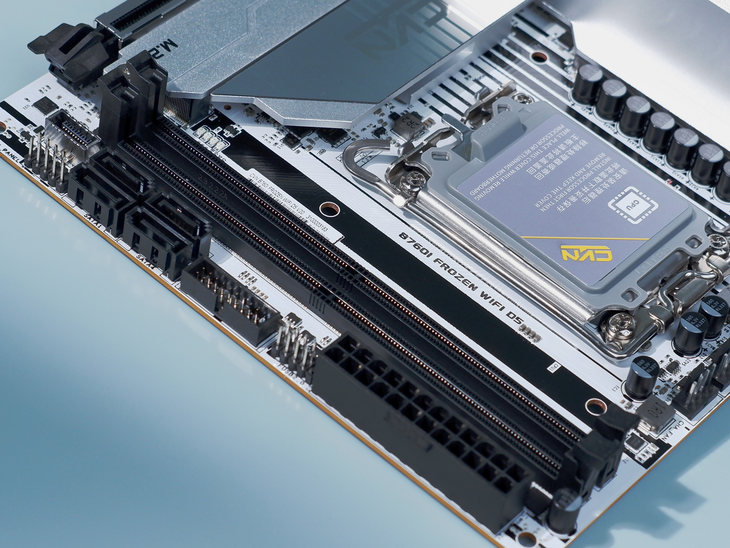 七彩虹CVN B760I FROZEN WIFI D5 V20 登陸艦主板延續(xù)了七彩虹CVN家族化戰(zhàn)艦設(shè)計(jì)語(yǔ)言。主板采用白色PCB,配備大范圍銀色散熱片,非常適合搭配白色側(cè)透機(jī)箱使用。