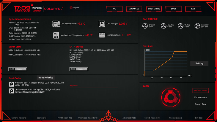 BIOS的主界面顯示了豐富的系統(tǒng)信息,并且設(shè)計(jì)了XMP內(nèi)存超頻開(kāi)關(guān)、RAID開(kāi)關(guān)、風(fēng)扇轉(zhuǎn)速調(diào)節(jié)、EZ OC切換等選項(xiàng)。