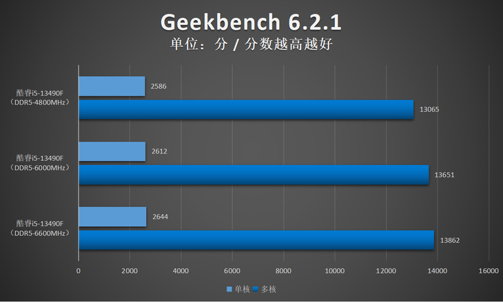Geekbench測(cè)試項(xiàng)目中,在加持了高頻DDR5內(nèi)存之后,對(duì)13代酷睿的性能提升也是比較明顯的。