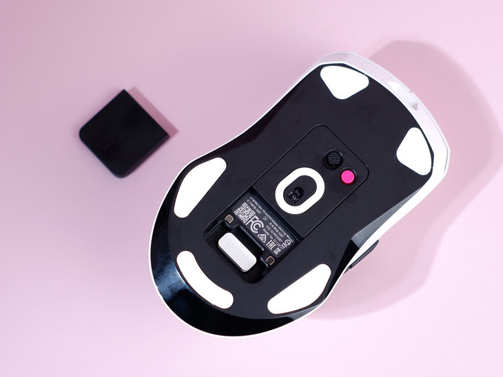 再來看鼠標(biāo)底部。設(shè)計(jì)有一個(gè)鼠標(biāo)開關(guān)以及一個(gè)粉色按鍵。這個(gè)粉色按鍵可以自定義,其出廠默認(rèn)的功能是調(diào)節(jié)鼠標(biāo)指針?biāo)俣取?/p>
