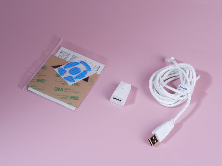這款鼠標(biāo)包裝盒內(nèi)部附帶一個(gè)轉(zhuǎn)接頭,一條白色的1.8m傘繩材質(zhì)連接線,以及備用腳墊等等。