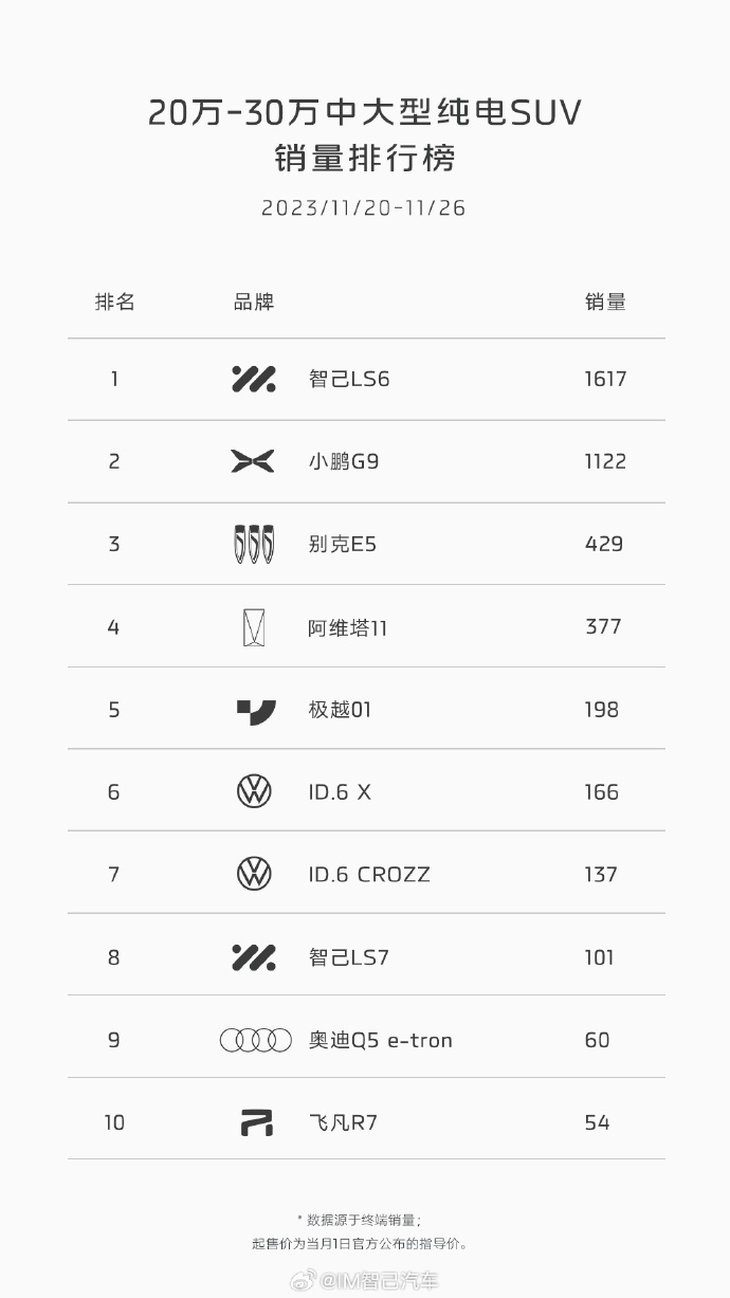 來自IM智己汽車官方微博的新消息。智己LS6持續(xù)熱銷,在11月20日至26日這一周的銷量達到1617輛,單周銷量力壓小鵬G9、阿維塔11、別克E5等中大型純電SUV熱門車型。豪華的配置加上非常誘人的定價,智己LS6值得給予更多關注。