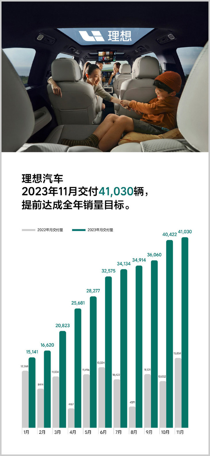 來自理想汽車官方微博的消息。理想汽車11月交付41030輛,創(chuàng)理想汽車單月交付量新高。同時,理想汽車已連續(xù)2個月交付量超4萬。此外,截至2023年11月30日,理想汽車全年累計交付325677輛,提前達(dá)成2023年30萬輛銷量目標(biāo)。