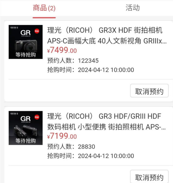 ? ? 同樣是熱門APS-C畫幅便攜機產品的理光GR III HDF和GR IIIx HDF在上月發(fā)布,雖然性能只是小改,不過不知道是否大家搶不到更具人氣的富士X100VI,部分用戶決定將焦點放在“新歡”理光GR III HDF和GR IIIx HDF身上。根據日本asobinet網站透露,理光GR III HDF和GR IIIx HDF在中國商城的預訂數量分別達到約2.8萬臺及12.2萬臺,雖然數字上遠遠不及今年2月號稱國內超過百萬預定的富士X100VI訂單,但是也反映出理光GR III HDF系列在中國市場相當受歡迎,這15臺部的訂單以理光的產能,至少要大半年以上才可以慢慢消化。