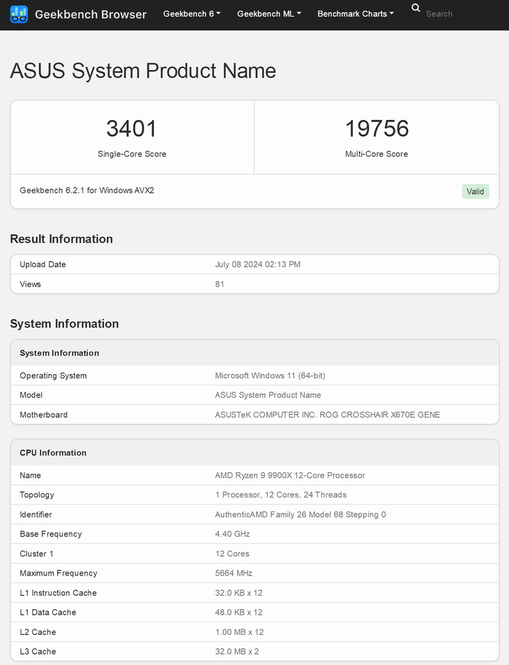 目前銳龍9 9900X這款處理器的跑分成績(jī)已經(jīng)出現(xiàn)在了geekbench的數(shù)據(jù)庫(kù)當(dāng)中。測(cè)試版本為geekbench 6.2.1,其單核心成績(jī)?yōu)?401分,多性能成績(jī)?yōu)?9756,測(cè)試時(shí)間為7月8日。測(cè)試使用的主板為華碩ROG CROSSHAIR X670E GENE,內(nèi)存為32GB。