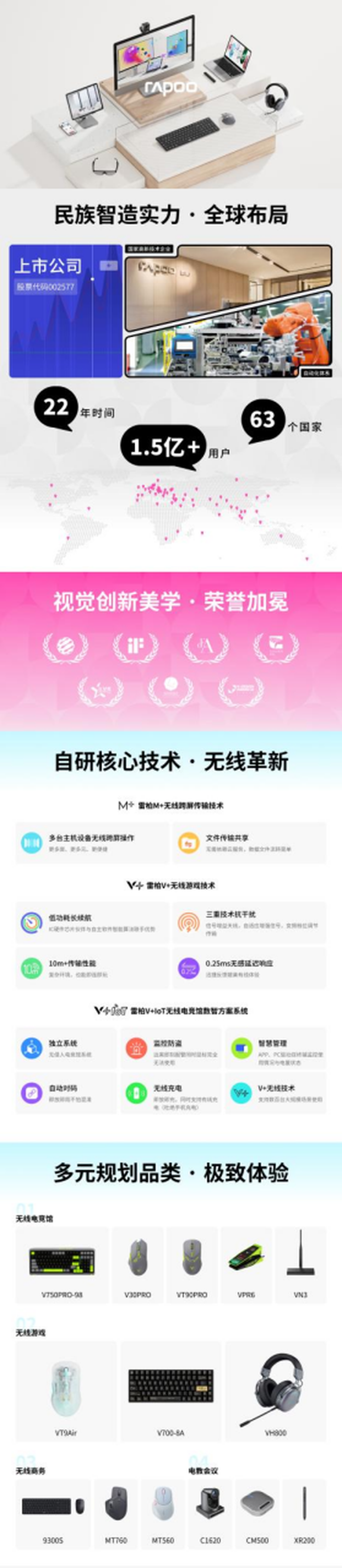 Rapoo雷柏,成立于2002年,外設(shè)行業(yè)上市公司,國 家級高新技術(shù)企業(yè),首批國家智能制造試點示范企業(yè)。厚積“無線技術(shù)”核心推進(jìn)行業(yè)標(biāo)準(zhǔn),堅實產(chǎn)品力與品牌力雙輪驅(qū)動,以市場需求為指引,以用戶體驗為宗旨,加速全球化布局,持續(xù)拓展『無線生活』應(yīng)用場景。