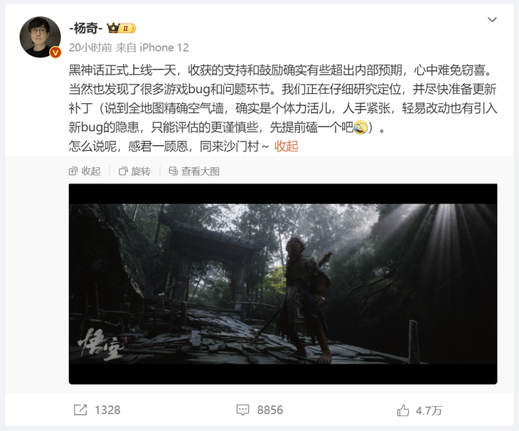 對于很多玩家反饋的《黑神話:悟空》“空氣墻”問題,游戲科學聯(lián)合創(chuàng)始人,《黑神話:悟空》美術總監(jiān)楊奇目前做出了回應:是個體力活兒,人手緊張,輕易改動也有引入新bug的隱患,只能評估的更謹慎些。